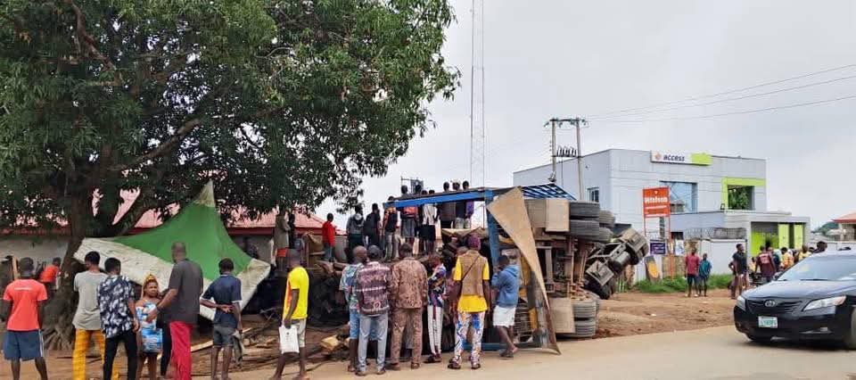 Some Traders escaped death this Tuesday morning at Timber Industrial Market, Umuahia when a trailer loaded with Timber fell down while trying to drive into the Market.